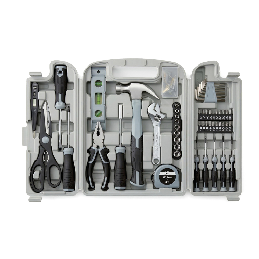 | 内容量 | 32.5×25.2×6.4cm・デジタル電気テスター×1、万能ハサミ×1、ドライバー×2、水平器×1、ペンチ×1、ドライバー型ハンドル×1、ネイルハンマー×1、モンキーレンチ×1、コンベックス×1、ねじセット×1、ソケット×9、六角棒レンチ×8、ビット×19、ソケットアダプター×1、精密ドライバー×5・炭素鋼 |