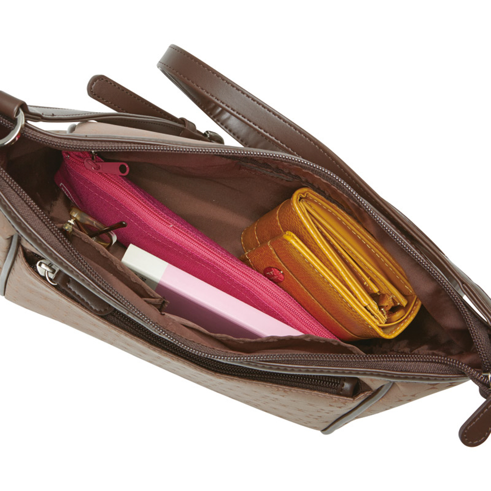 ハナエモリのロゴマークの蝶をちりばめた生地が女性らしい印象のアイテムです。ファスナー開閉式。前面ファスナーポケット・内ファスナーポケット×各1室、オープンポケット×2室。ショルダーベルト着脱不可(長さ調節可)。
