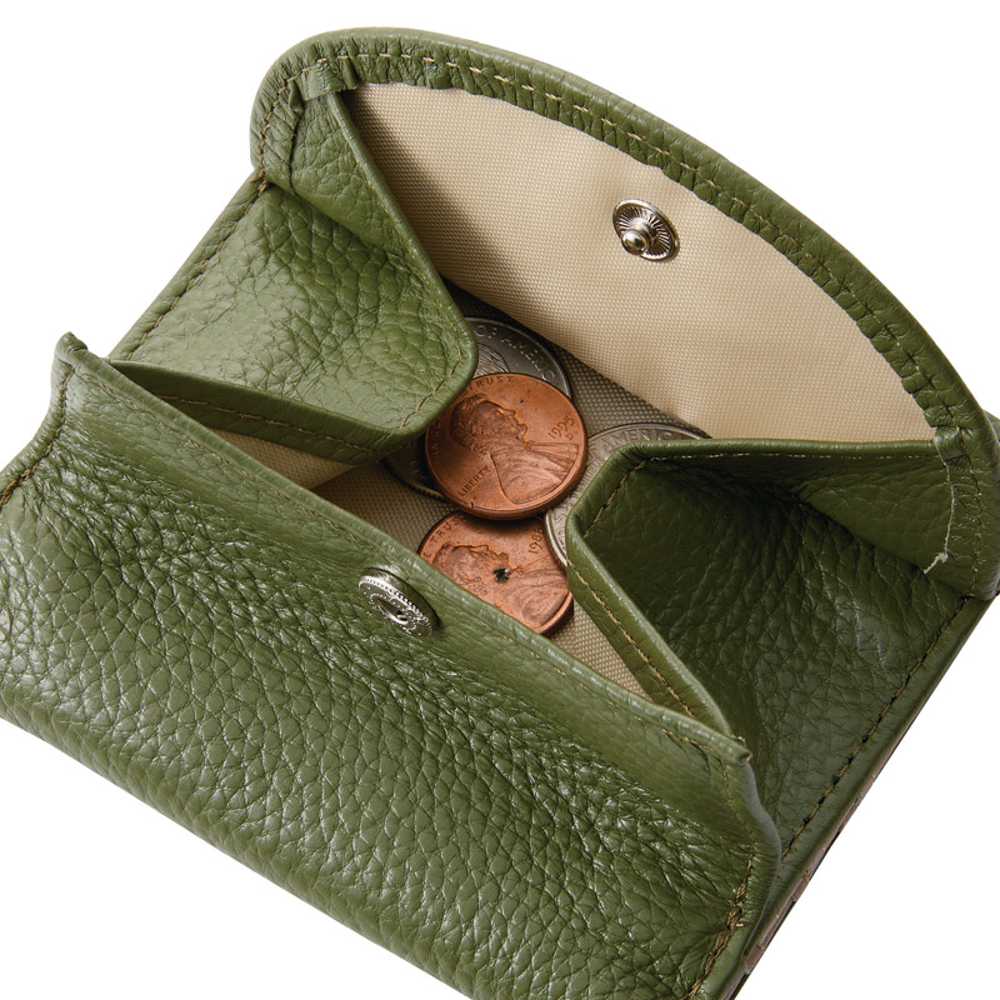 コンパクトながら折らずに収納できる札入や大きく開いて見やすい小銭入れが付いた牛革ミニ財布。
