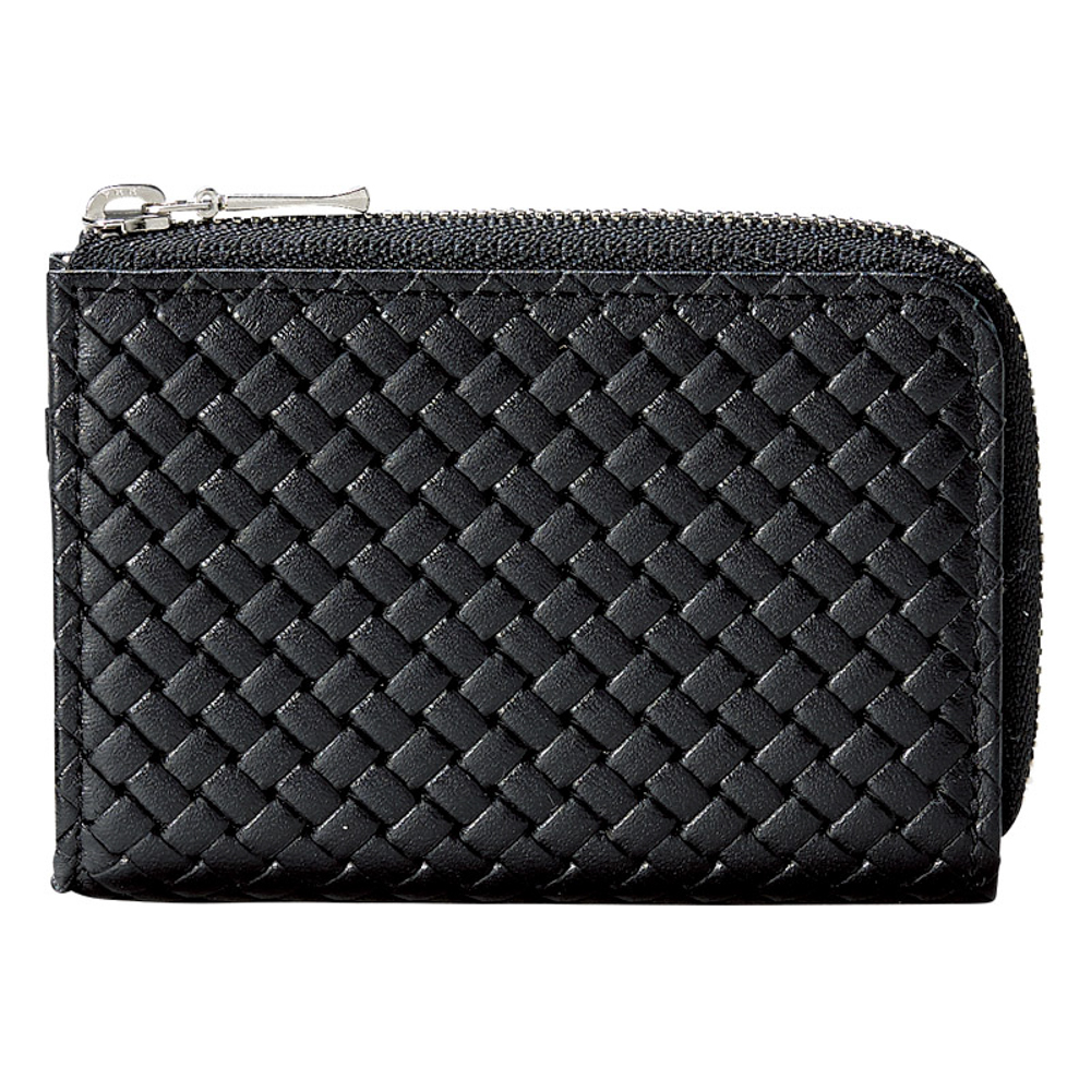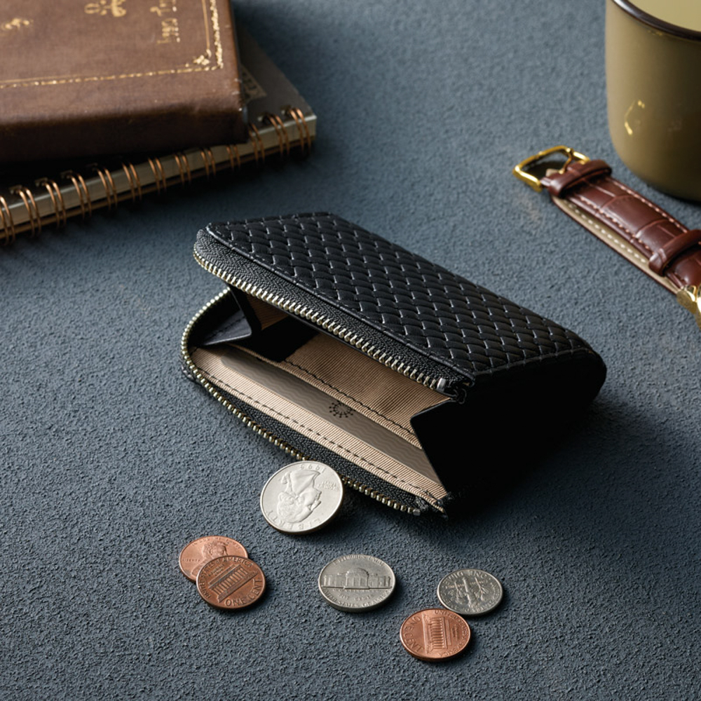 メッシュ柄の型押しされた牛革のカード入れが付いた使いやすいラウンドタイプの小銭入れ。