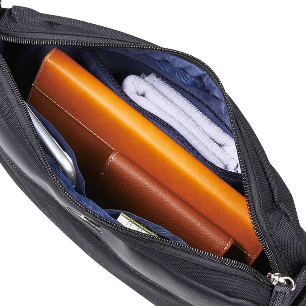 前面ファスナーポケット・内ファスナーポケット×各1室、内オープンポケット×2室。