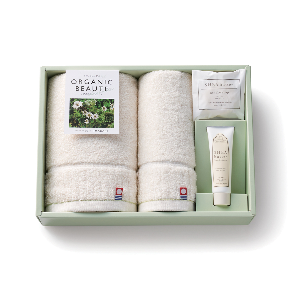 ふんわりしたオーガニックコットンのタオルにシアバターを配合した大人女子が幸せ感じる今治タオル。
