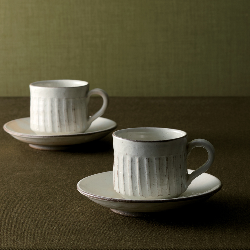 手作業で削られた削ぎ模様が味わい深い碗皿ペア。