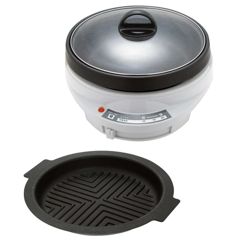 内径約23cm・深さ約6cm(容量約2.4L)の鍋物などに便利なグリルパンに溝付でお肉などの余分な脂を落としてくれる焼肉プレートをセット。