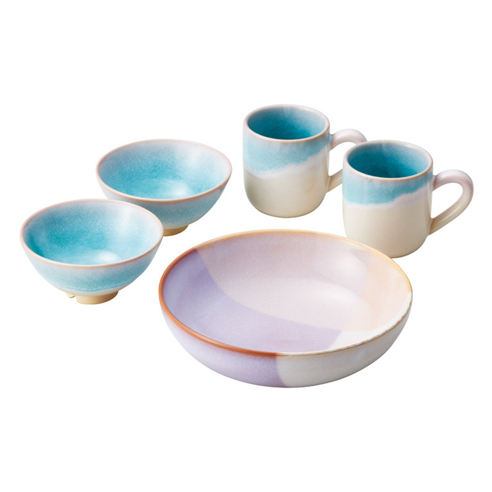 マグ2個、お茶碗2個、ボウルLサイズが1個の毎日大活躍の嬉しいセットです。
