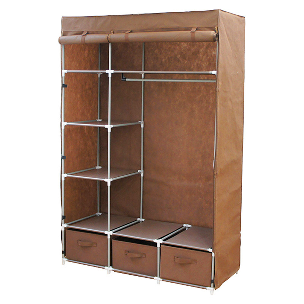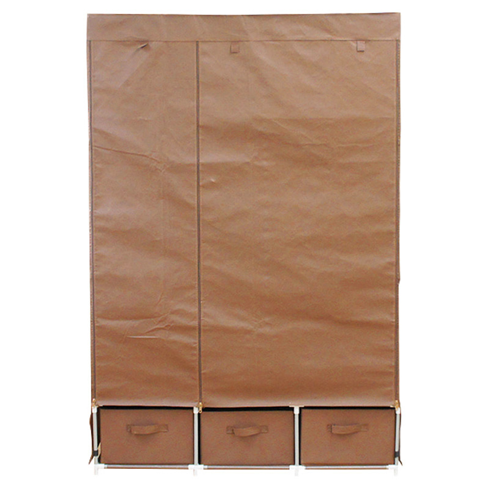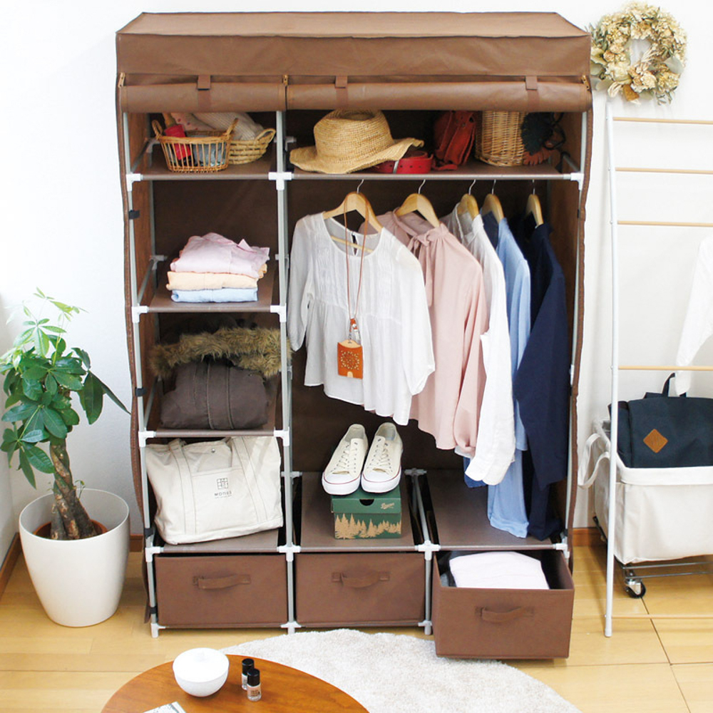引き出しが3個付いています。衣類をホコリから守ります。収納して隠し見た目すっきりのカバー付インテリアハンガー。耐荷重量:ハンガーバー1本あたり約10kg、棚板1枚あたり約1kg、引出し1杯あたり約1kg。