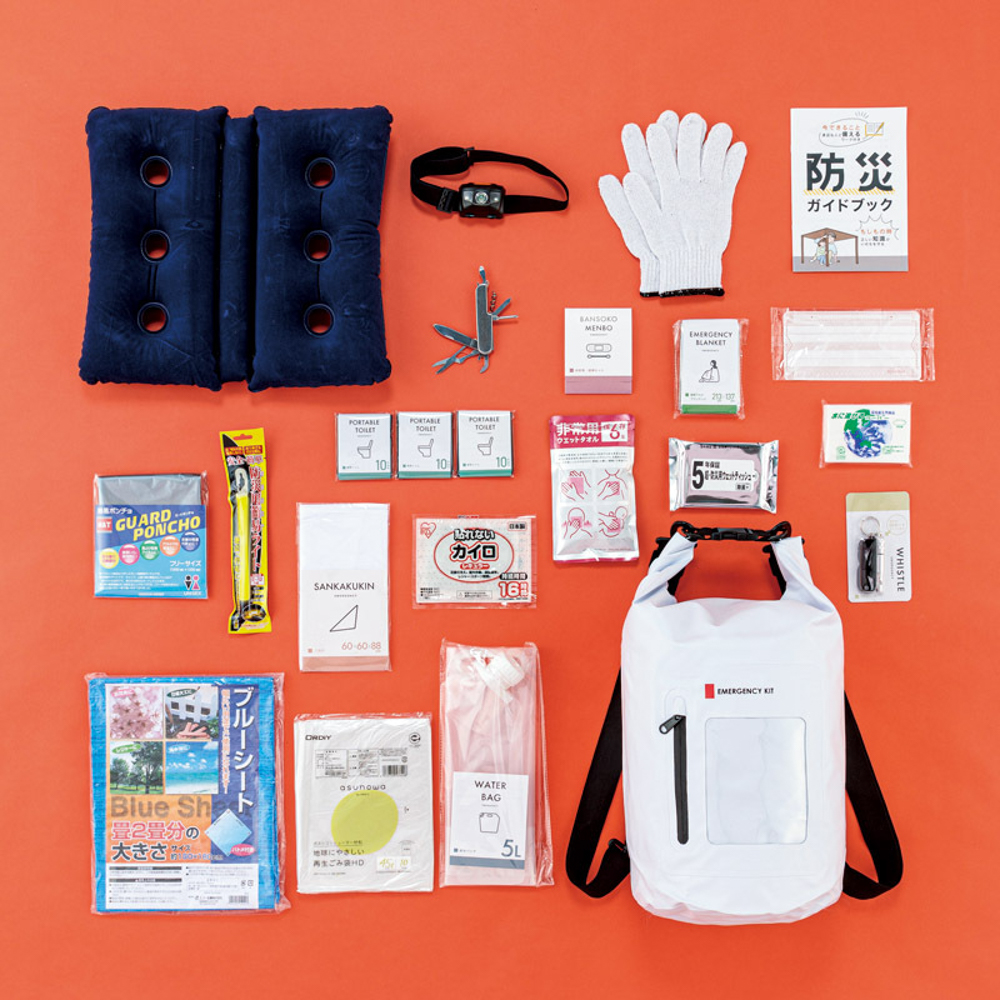 | 内容量 | 31×39×10cm・防水ドライバッグ(径25×60cm)、軍手、エアークッション、水に流せるポケットティッシュ、使い捨てカイロ、使い捨てマスク、携帯トイレ(1回分)×3、乾電池式ヘッドライト、防災ガイドブック、ブルーシート、給水バッグ(5L)、八徳ナイフ、ゴミ袋(半透明45L)、ウェットティッシュ、三角巾、静音アルミブランケット、絆創膏・綿棒セット、非常用呼子笛(IDカード付き)、防災用簡易ライト、非常用ウェットタオル、ガードポンチョ・500Dターポリン、PE、PP、PC樹脂、鉄、ステンレス、100%再生紙、ポリエチレン、鉄、塩化ビニル樹脂、高分子ポリマー、鉄粉、水、活性炭、バーミキュライト、塩類、不織布、綿、ポリエステル、木、紙、アルミ蒸着ポリエチレン、アルミニウム、鉄(ニッケルメッキ)、ABS樹脂、水、エタノール、グリセリン、PET、PA、プラスチック、化学発光液、他 |