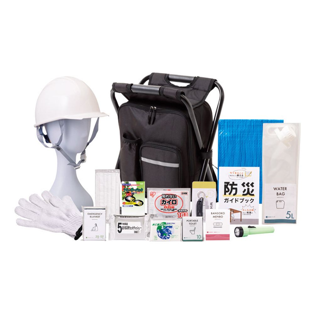 | 内容量 | 15×29×32cm(折畳時:35×50×8cm)・イス型リュック(撥水加工)(30×43×28cm(折畳時:35×50×8cm))、ヘルメットKGBo-1 ホワイト、蓄光LEDライト、チャック付き袋、使い捨てカイロ、ブルーシート、給水バッグ(5L)、使い捨てマスク、絆創膏・綿棒セット、水に流せるポケットティッシュ、ウェットティッシュ(5年保存)、静音アルミブランケット、携帯トイレ(1回分)、非常用呼子笛(IDカード付)、軍手、防災ガイドブック・600Dポリエステル、鉄、ABS樹脂、ポリエチレン、ポリスチレン、ポリプロピレン、鉄粉、活性炭、バーミキュライト、塩類、水、PET、PA、PE、不織布、100%再生紙、エタノール、グリセリン、アルミ蒸着ポリエチレン、高分子ポリマー、アルミニウム、鉄(ニッケルメッキ)、ナイロン、綿、ポリエステル、紙、他 |