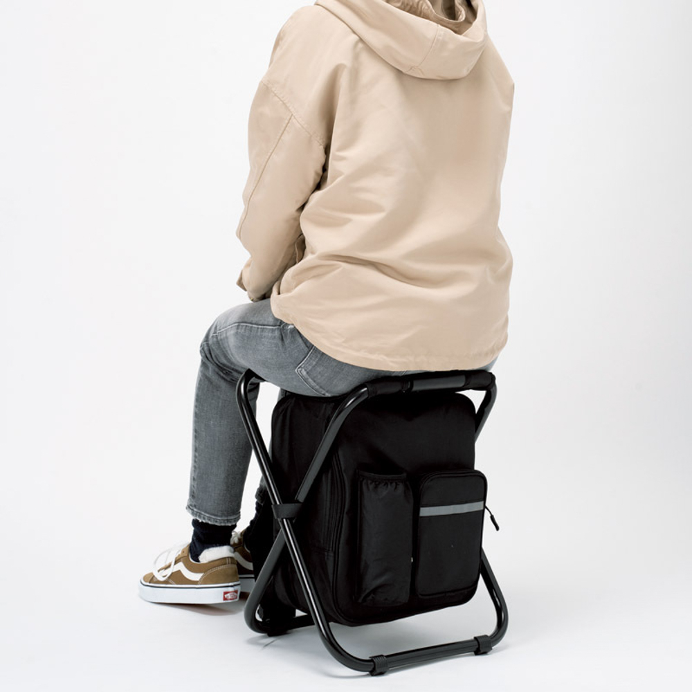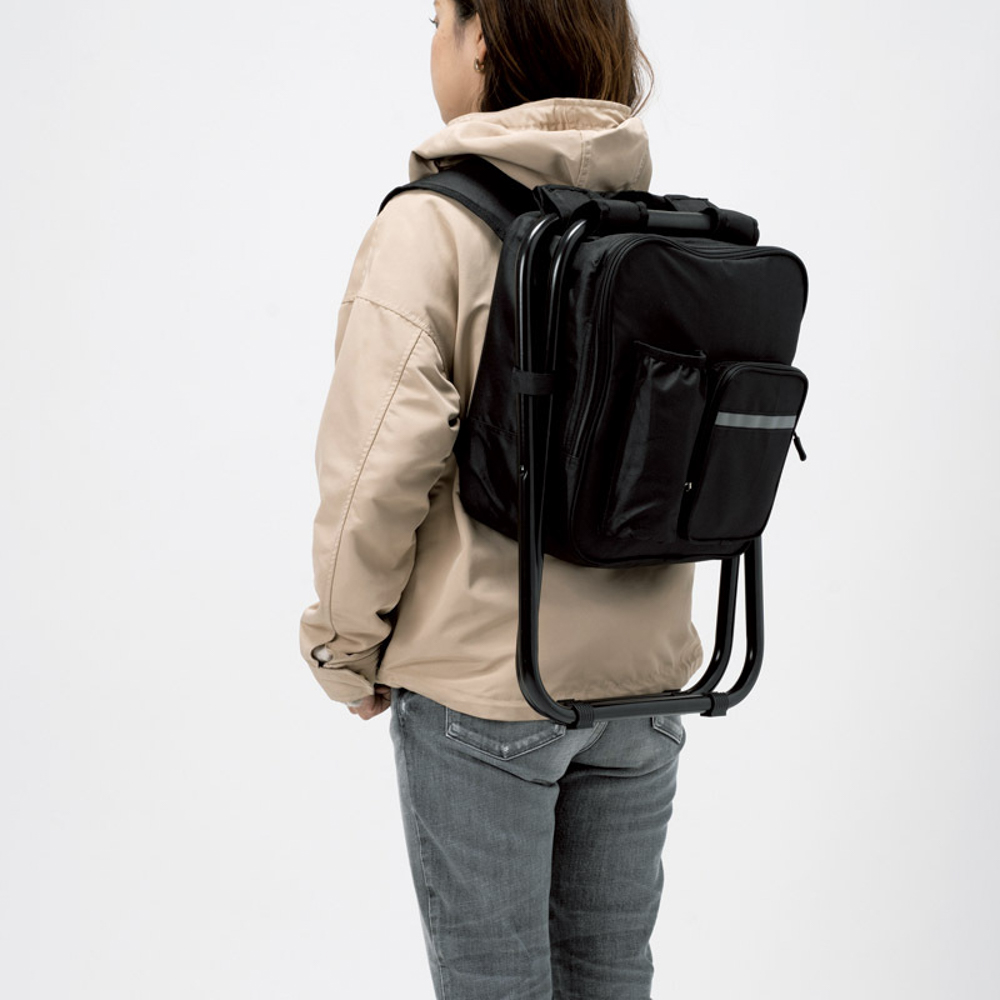 イス型リュック:ペットボトルサイズポケット・反射材付きポケット・背中部分肩紐入用ポケット×各1室。
