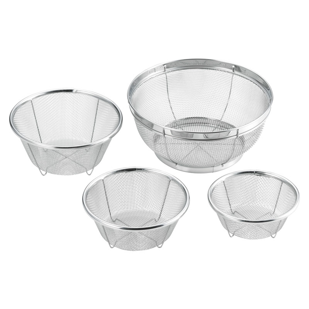 13cm(径13×5.2cm)・15cm(径15×6.5cm)・17cm(径17×8.2cm)・22cm(径22×9.8cm)×各1・アミ:18-8ステンレス、枠:ステンレス