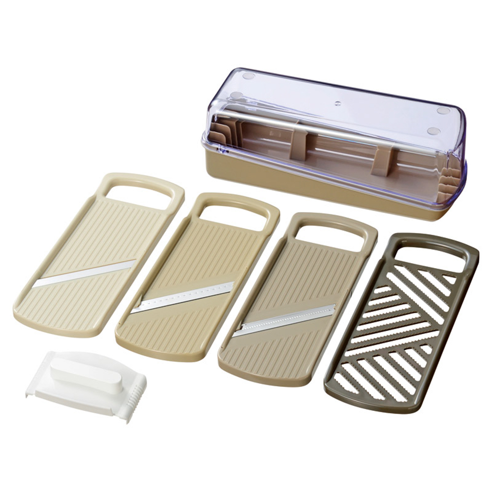 容器収納ケース(収納時:8.5×23.5×8.8cm)・スライサー・千切り・つま切り・おろし・安全ホルダー×各1・ABS、ステンレス、AS、PP
