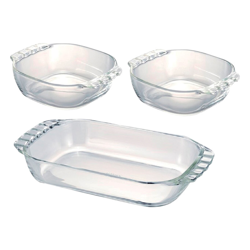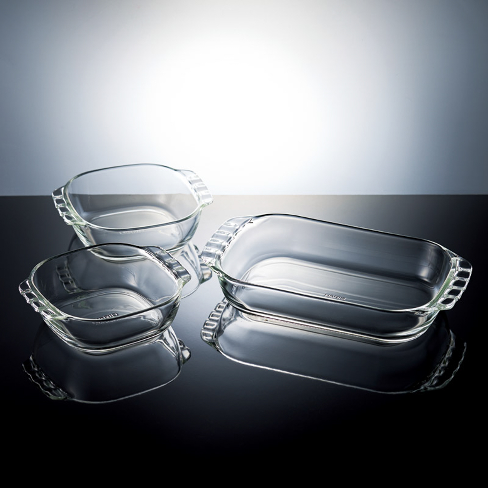 大(24.9(持手含む)×13.6×4.5cm)×1、小(15.3(持手含む)×12.7×4.5cm)×2・耐熱ガラス