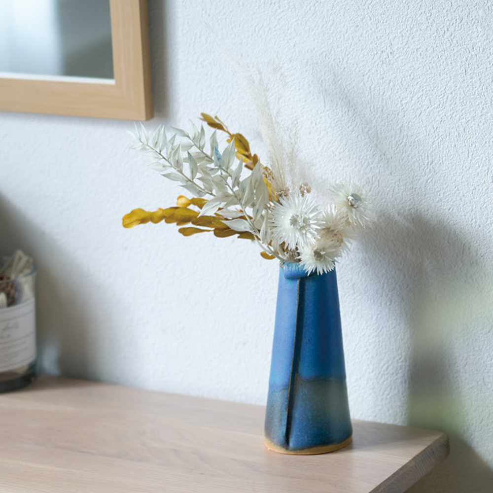 艶やかなトルコブルーが雰囲気ある手作りの花入。
