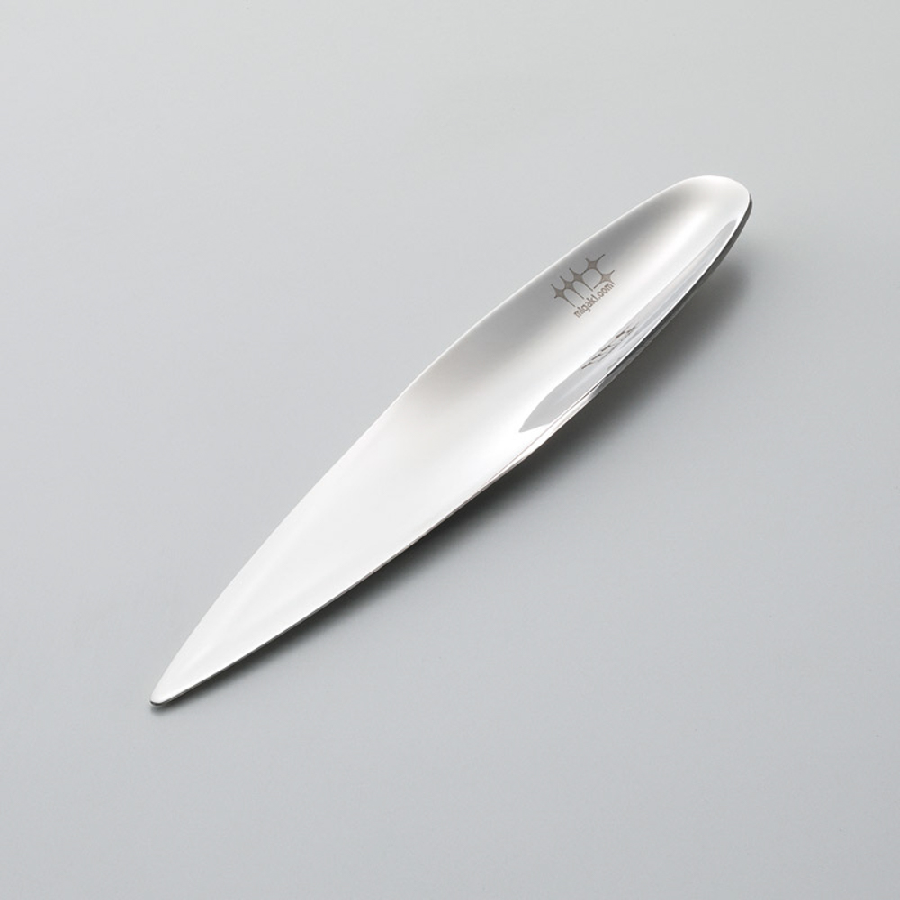 新潟県燕市の金属研磨職人が、手間と時間を掛けじっくりと磨き上げて造ったシンプルなリーフ型のペーパーナイフ。