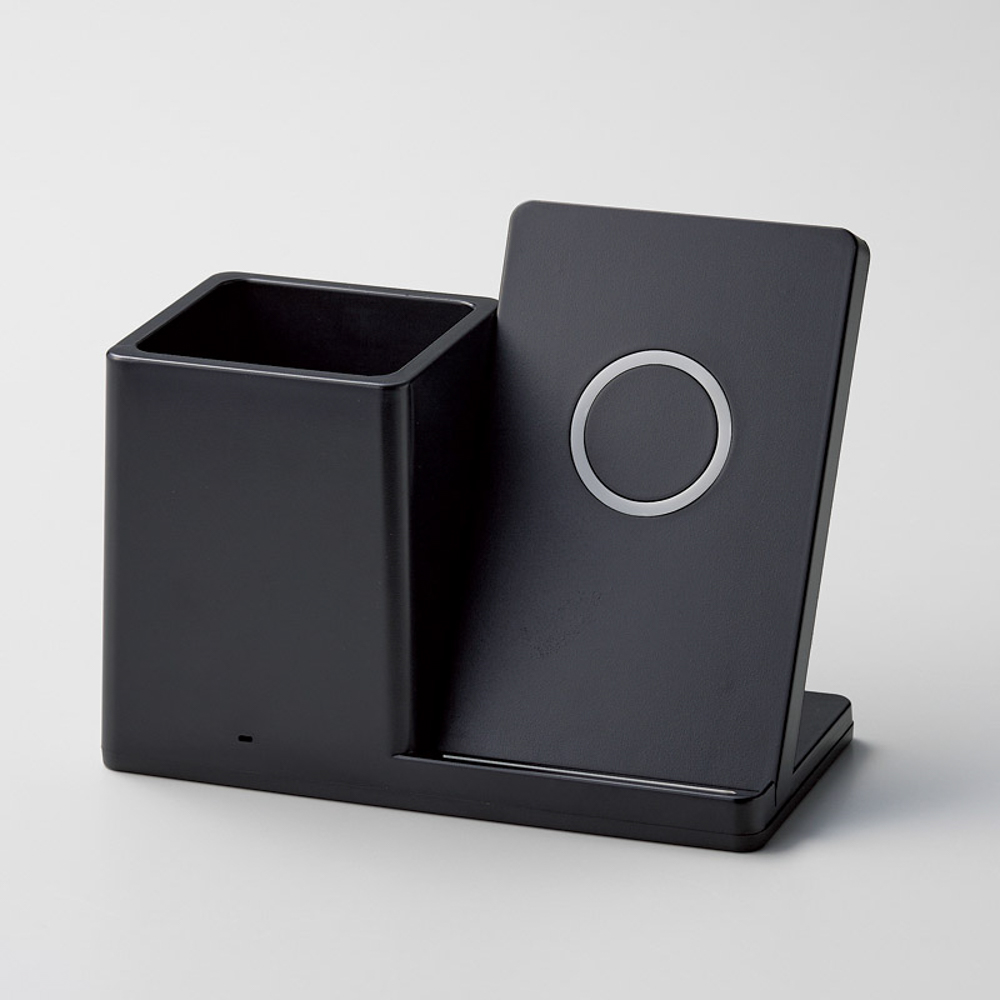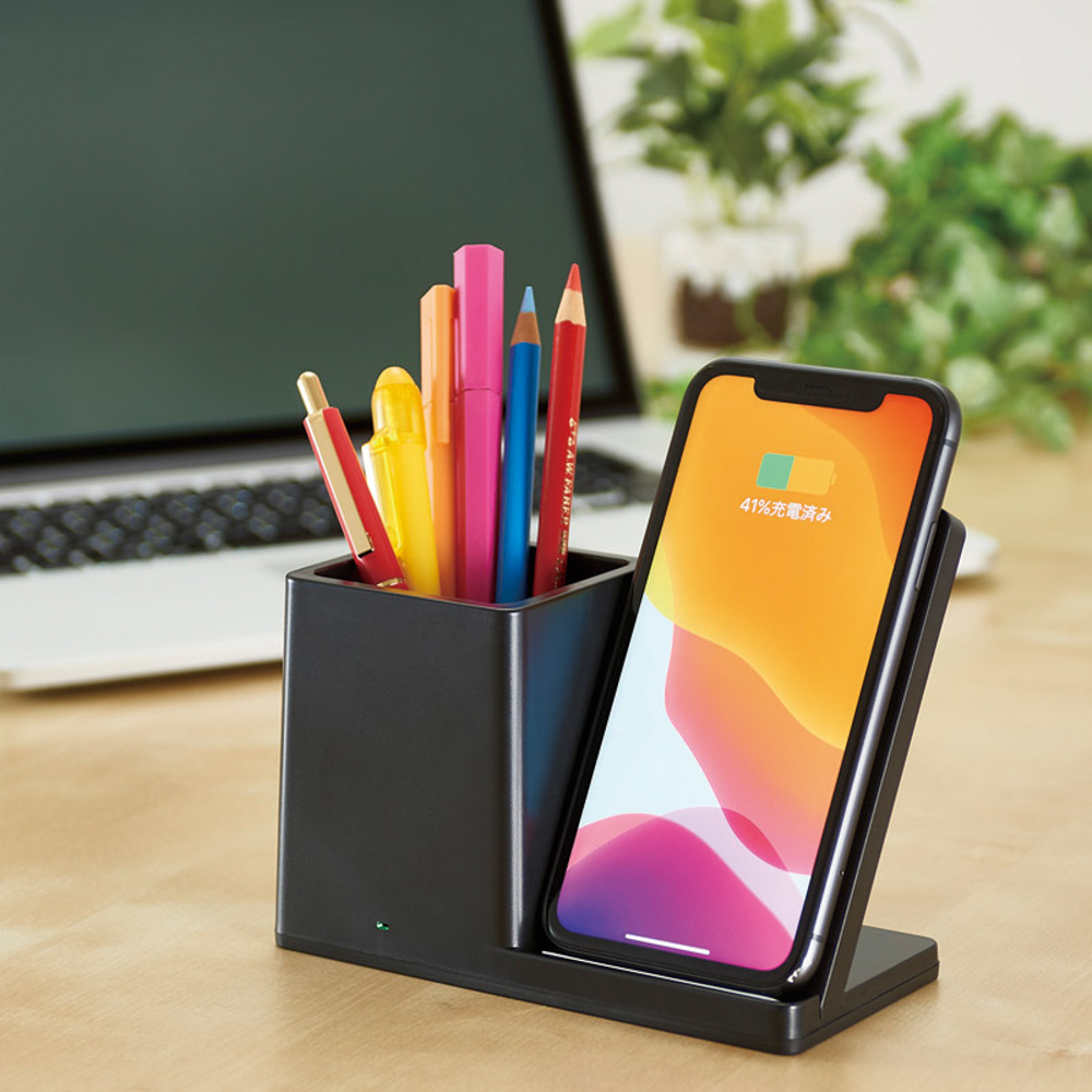 qi対応のスマートフォンを置くだけで充電が出来る、便利なペンホルダーの付いたワイヤレス充電器です。背面にUSBポートも1つ付いており、ワイヤレス充電に対応していないスマートフォン等も充電可能です。USBポート・USBコード・ペンホルダー付。