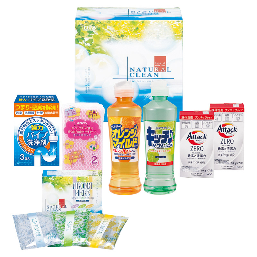 | 内容量 | 19.0×10.5×23.0cm・花王アタックZEROワンパック(10g×7袋)×2、キッチンリフレッシュコンパクト(270ml)・オレンジマイルドコンパクト(270ml)・パイプ洗浄剤(3包入)・ハーブエキス配合入浴料(30g×3包入)・ネットスポンジ(2個入)×各1 |