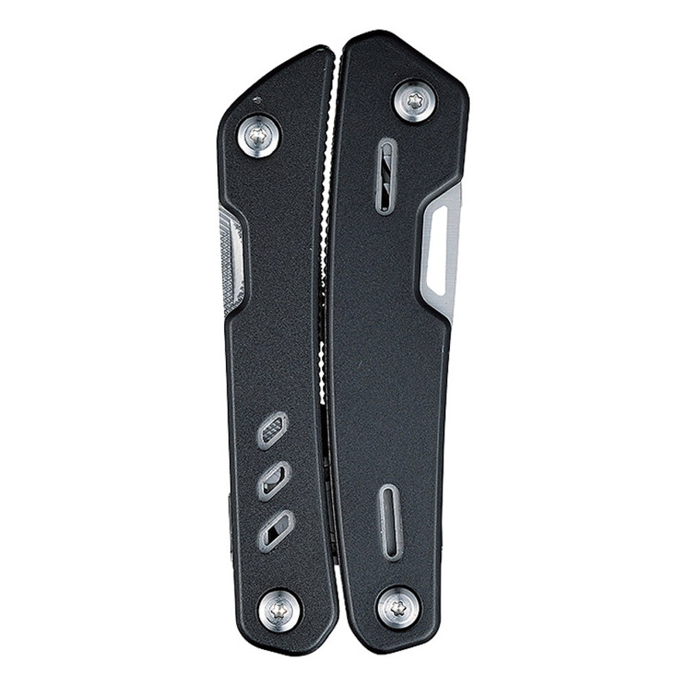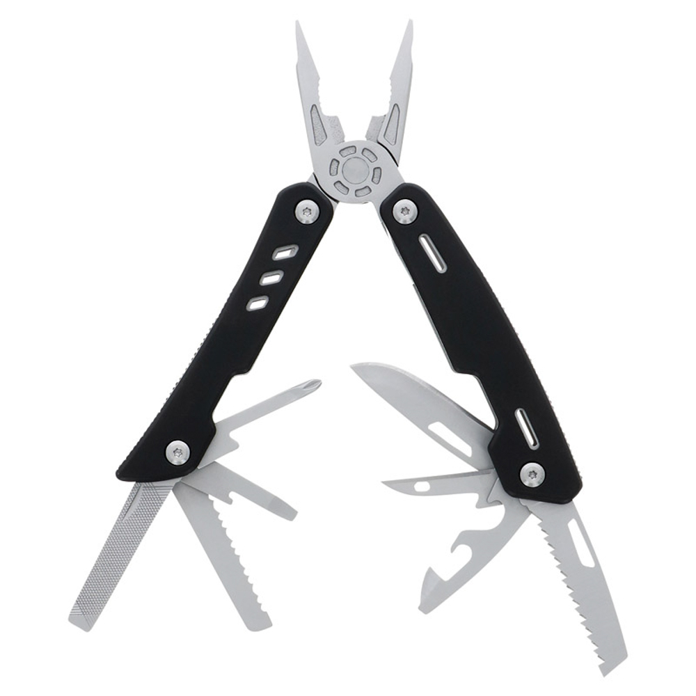 11機能(ペンチ・ワイヤーカッター・プラスドライバー・マイナスドライバー・波型ナイフ・爪ヤスリ・栓抜き・缶切り・ナイフ・革の穴あけ・のこぎり)搭載。