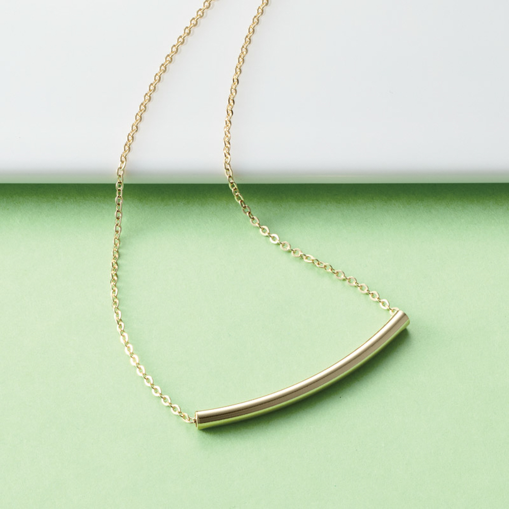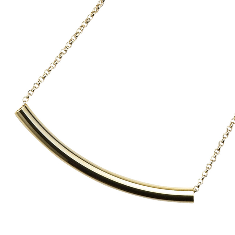 デコルテに大きくカーブしたロングバーが印象的なバースタイルのネックレス。