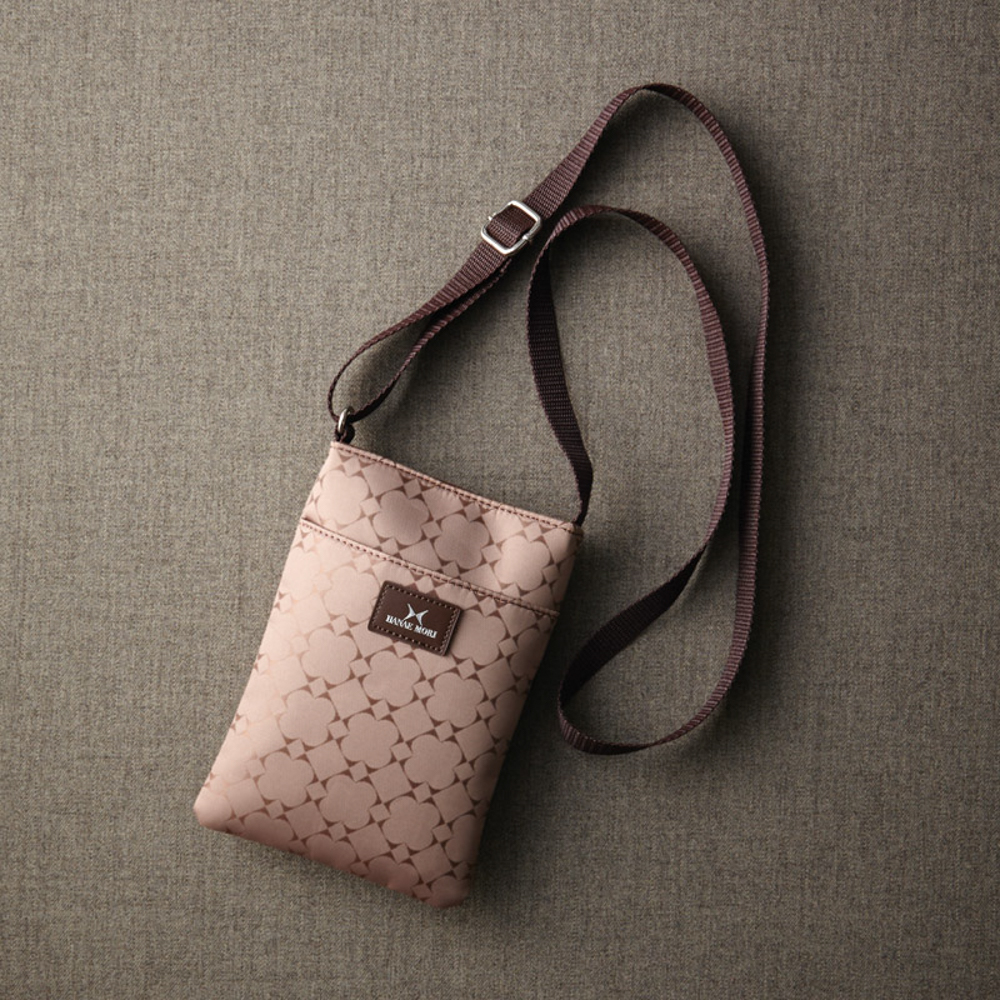 ハナエモリのロゴマークの蝶をちりばめた生地が女性らしい印象のアイテムです。面ファスナー開閉式。前面オープンポケット×1室。ショルダーベルト着脱不可(長さ調節可)。ショルダーベルト立上り約31~61cm。