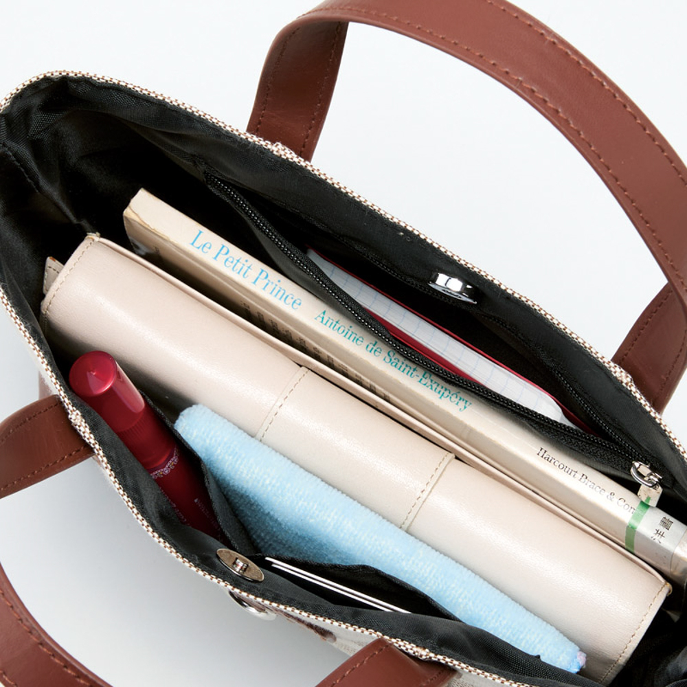 外オープンポケット・内ファスナーポケット×各1室、内オープンポケット×2室。