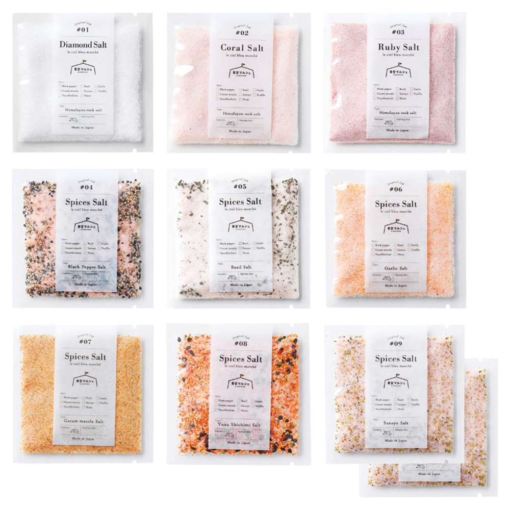 | 内容量 | スパイスソルト(ダイヤモンド・コーラル・ルビー・ブラックペッパー・バジル・ガーリック・ガラムマサラ・柚子七味)(各約20g)×各1、スパイスソルト(山椒)(約20g)×2 |