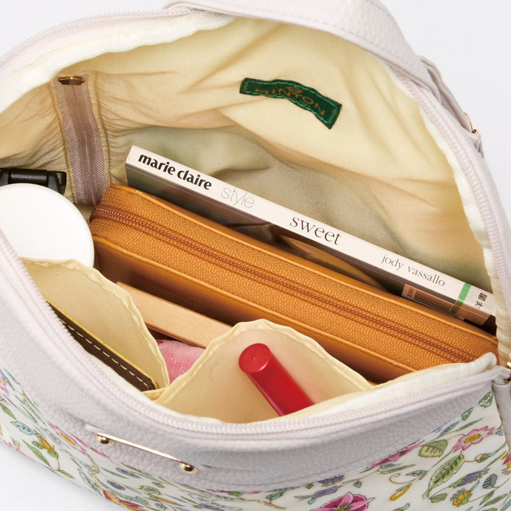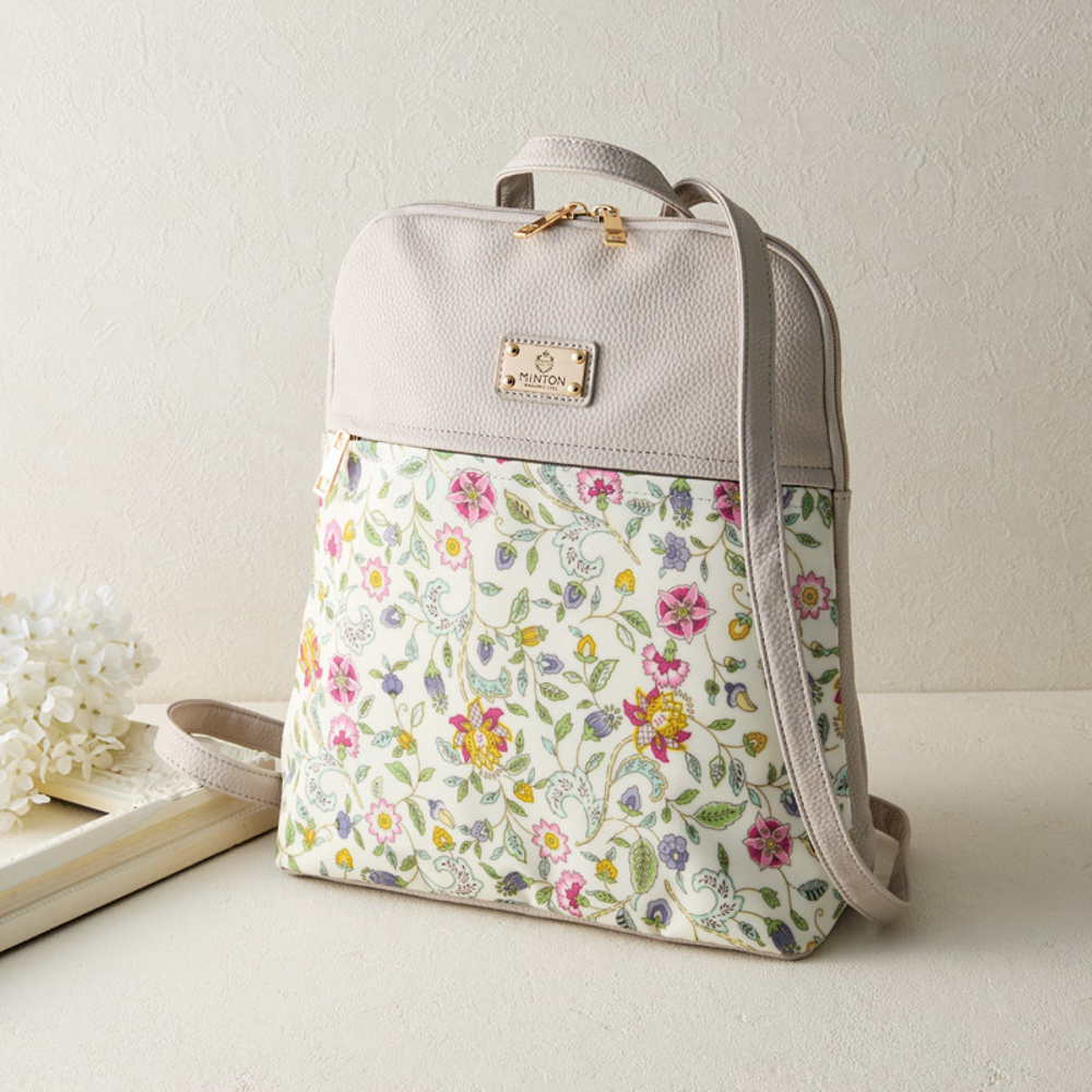 MINTONを代表するハドンホール柄とベージュの合皮生地のバランスが美しいリュック。マチも薄めで大人の女性も持ちやすいデザインになっています。ファスナー開閉式。内オープンポケット×2室、前面ファスナーポケット・背面内部直結ファスナー×各1室。