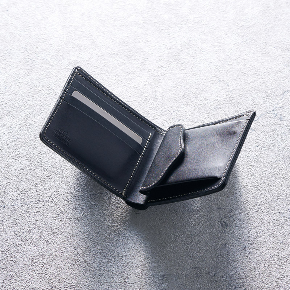 ヌメ革の存在感を活かした折財布は大阪の職人が1針1針丁寧に縫上げています。札入×2室、ホック式小銭入×1室、ポケット・カード入×各3室。