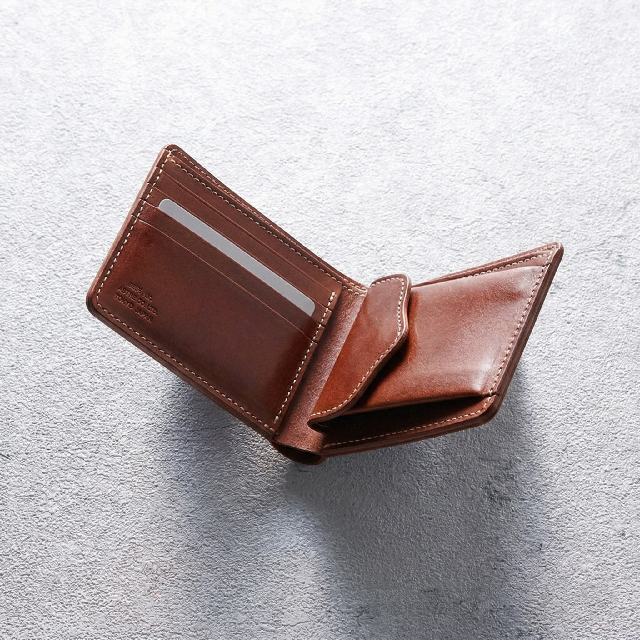 ヌメ革の存在感を活かした折財布は大阪の職人が1針1針丁寧に縫上げています。