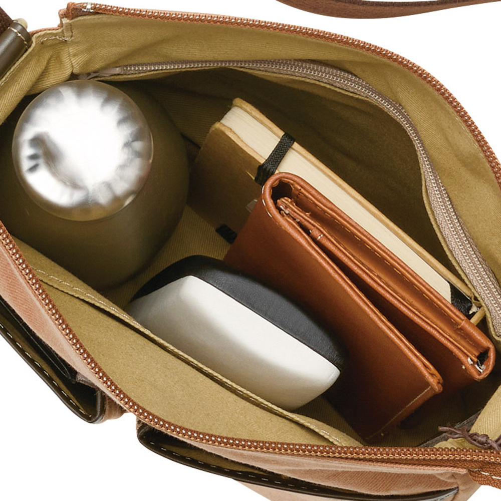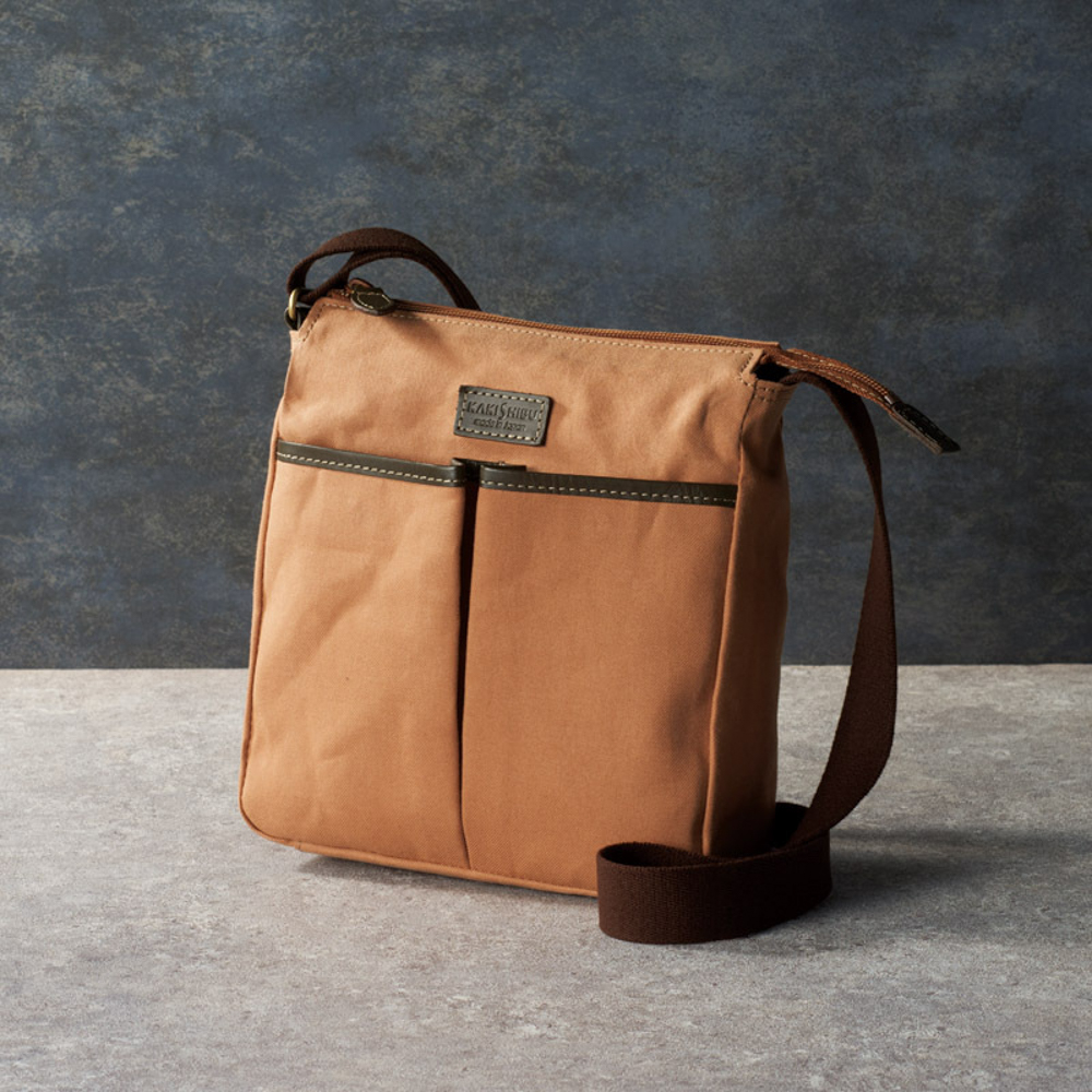 日本の職人さんが、一つ一つ丹念に作りました。柿渋染ならではの風合いをお楽しみください。内ファスナーポケット×1室、オープンポケット×1室、外全面ホック付ポケット×2室。ショルダーベルト着脱不可(長さ調節可)。