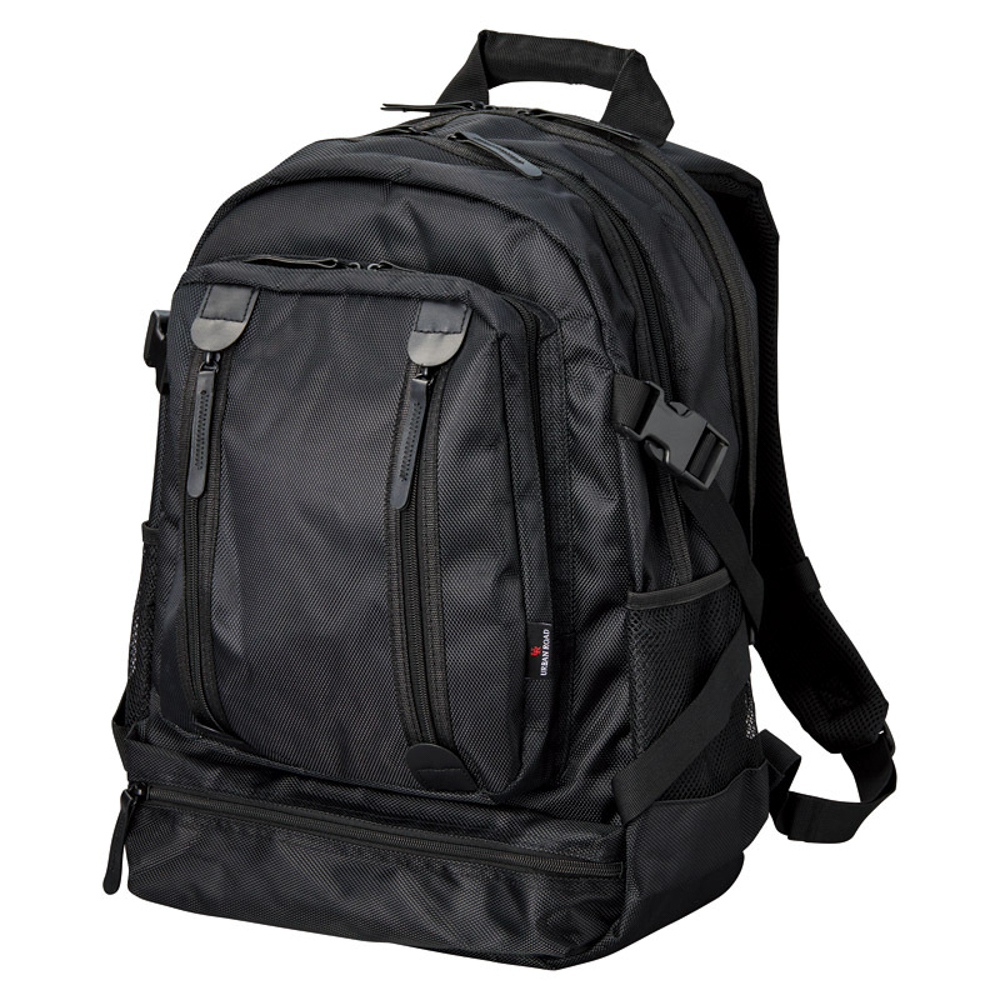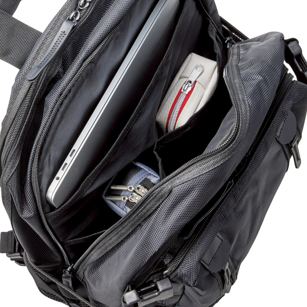 前面ファスナーポケット×3室、前面サブルームオープンポケット・カブセポケット・携帯電話用ポケット×各1室、内オープンポケット×3室、背面オープンポケット(PC収納可能(ウレタン素材入り))×1室。