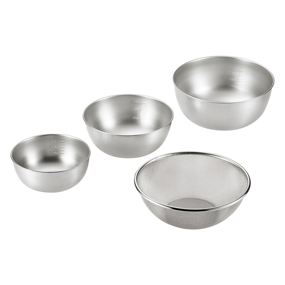 | 内容量 | ストロングメッシュザル22cm(径22×7.8cm)・ボウル15cm(径15.7×6.5cm・1L)・ボウル18cm(径19×8cm・1.6L)・ボウル21cm(径22×9.5cm・2.8L)×各1・18-8ステンレス鋼 |