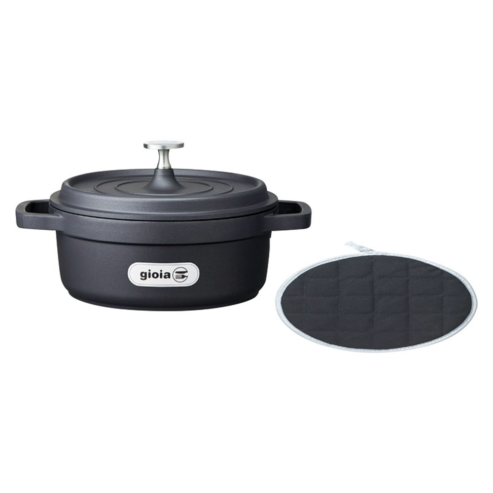 | 内容量 | 本体(27.8×21×14.5cm・2.5L)・耐熱オーブンミット鍋敷き×各1・本体・フタ:アルミニウム合金(内側:フッ素樹脂塗膜加工・外面:シリコンコート加工)・ツマミ:ステンレス鋼・PF、耐熱オーブンミット鍋敷き:(表面)綿(特殊耐熱樹脂加工)・(中材)ポリエステル・ナイロン・(裏面)綿(シリコン樹脂加工)・(不織布)ポリプロピレン |