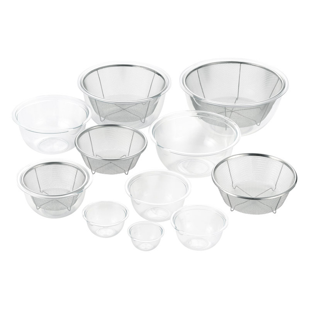 | 内容量 | ミニボウル7cm(径7×3.6cm)・ミニボウル9cm(径9×4.6cm)・ミニボウル11cm(径11×5.6cm)・ミニボウル13cm(径13×6.6cm)・ボウル15cm(径15×7.6cm)・ボウル17cm(径17×8cm)・ボウル19cm(径19×8.7cm)・ボウル21cm(径21×9.7cm)・ボウル24cm(径24×11.2cm)・ザル13cm(径13×5.3cm)・ザル15cm(径15×6cm)・ザル17cm(径17×6.2cm)・ザル19cm(径19×7.6cm)・ザル22cm(径22×8.2cm)×各1・ポリメチルペンテン、18-8ステンレス |