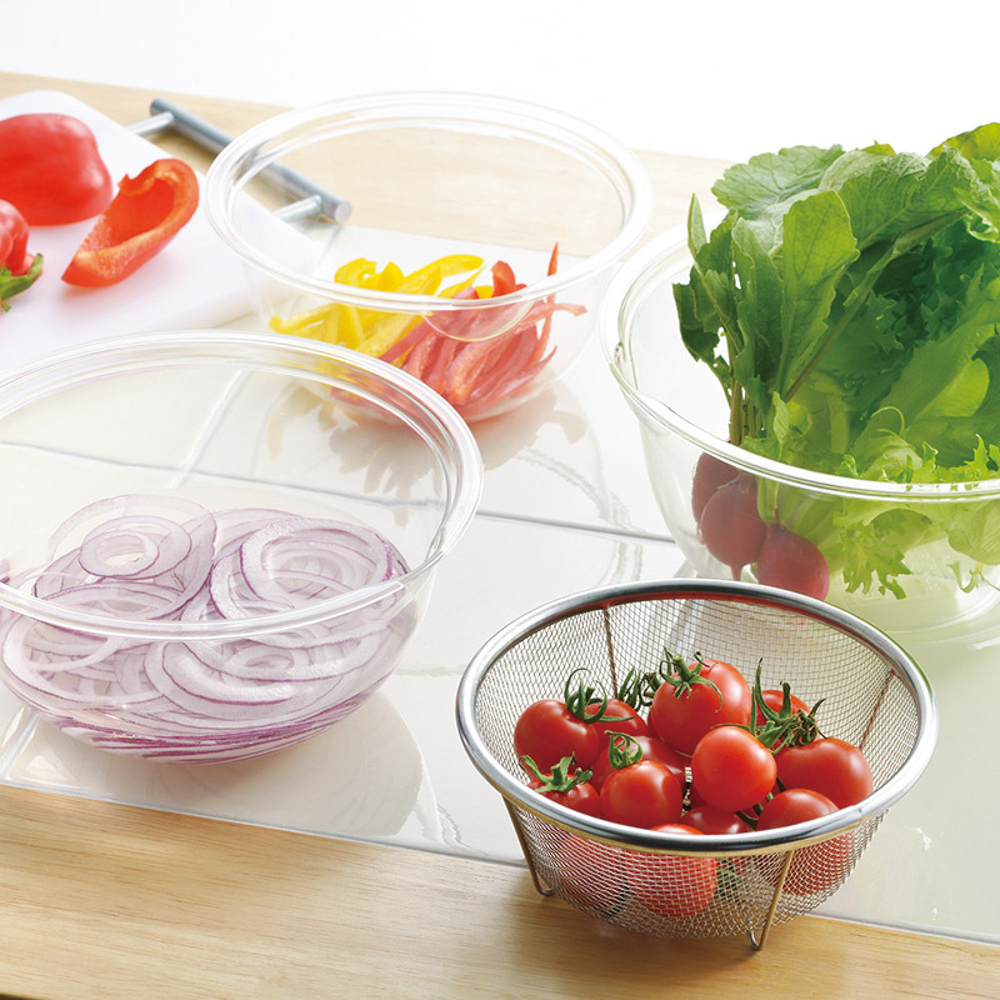 ガラスのように透明度が高く、中身が分かりやすい電子レンジ対応ボウルと、丈夫でさびにくいステンレスザルのセット。