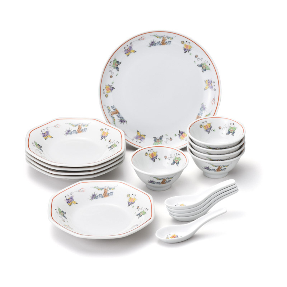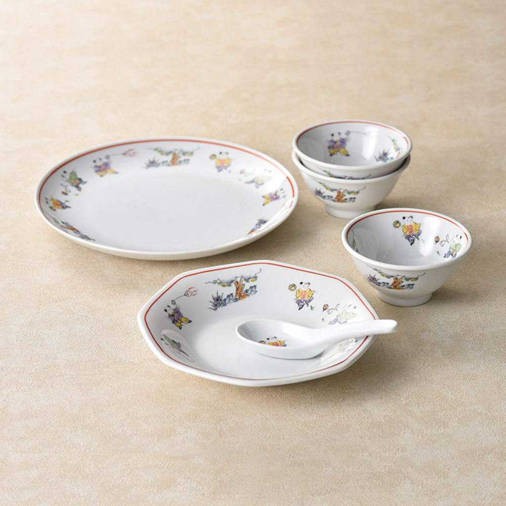 八角皿(19.5×19.5×3.5cm)・レンゲ・スープ碗(径11.8×6cm)×各5、大皿(径26×2.5cm)×1・磁器