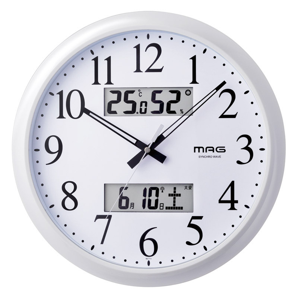 シンプルで視認性の高い多機能電波掛時計。ステップ秒針、カレンダー表示、六曜表示、温度表示、湿度表示、環境目安表示、電波受信状況表示、電波受信ON/OFF切替、夜間秒針停止。お試し用単3乾電池2本(付属)。