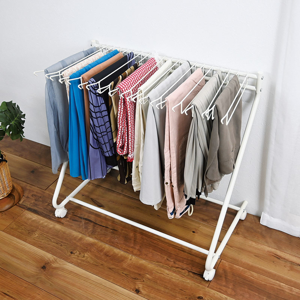 20本のハンガーにスラックス、スカート、ネクタイ等を掛けてスッキリ収納。ハンガーは左右にスイングするので取り出しやすく、持ち上げるだけで簡単に外せるので便利です。キャスター付きで移動も楽です。耐荷重量:約600g(ハンガー1本あたり)。