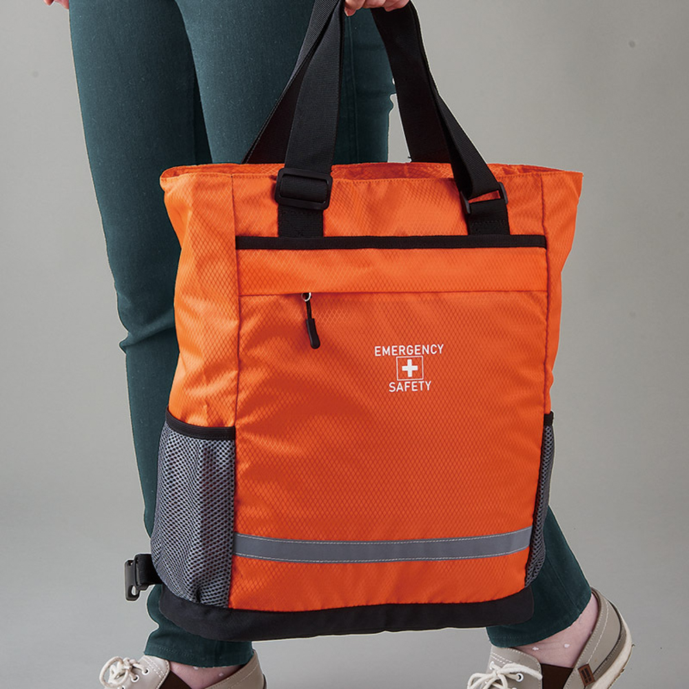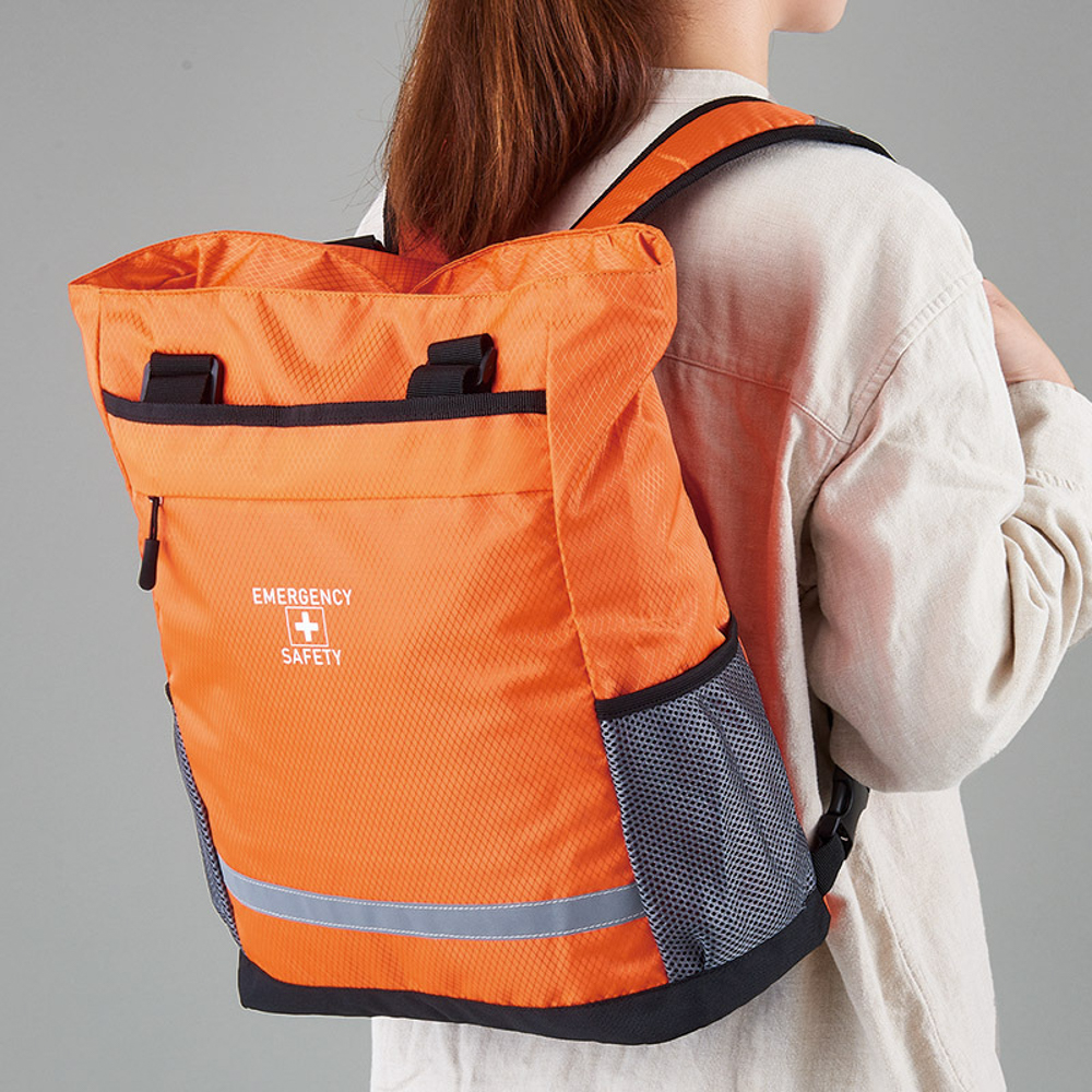 肩掛けトートも出来る2WAY仕様の避難用リュックに、各種防災グッズをセット。
