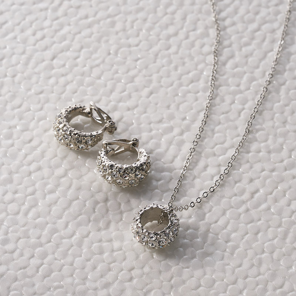 ラインストーンを贅沢に使用したきらめくパヴェリングモチーフのネックレスとイヤリングのセット。