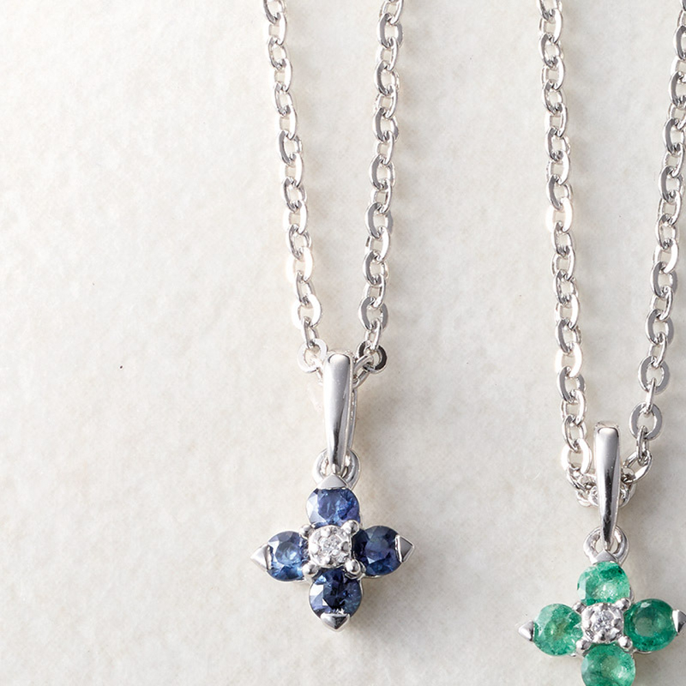 全長約40cm、トップ:約1.3×0.7cm・キュービックジルコニア、シルバー925(ロジウムメッキ)、真鍮(銀色メッキ)、サファイア:サファイア4石、エメラルド:エメラルド4石、ルビー:ルビー4石