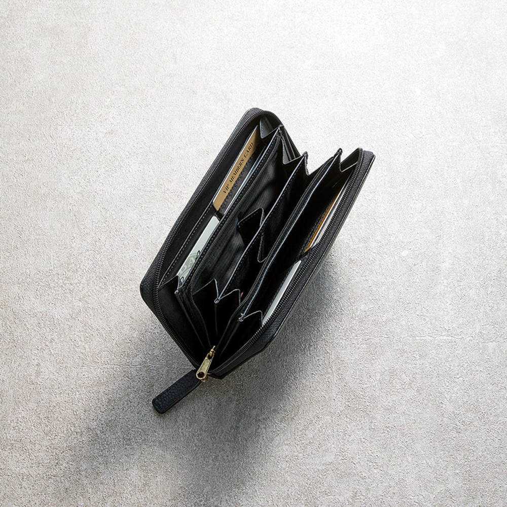 札入れ×2室、ファスナー式小銭入れ×1室(内側4室:実用新案登録済3218846)、カード入れ×12室、オープンポケット×2室。