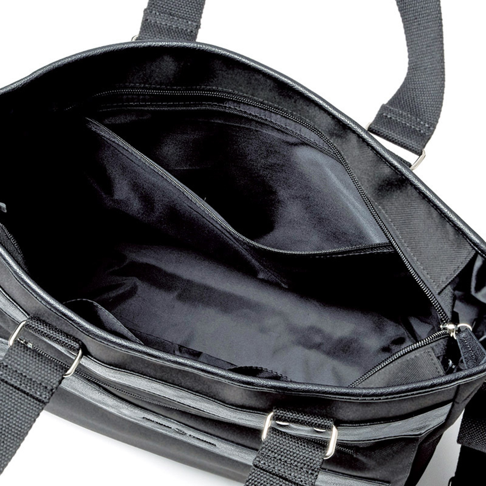 ビジネスでもカジュアルでも活躍できる多機能なトートバッグです。ファスナー開閉式。内ファスナーポケット×1室、内オープンポケット×2室、外ファスナーポケット×1室(中ポケットオープンポケット×2室)。ショルダーベルト着脱可(長さ調節可)。