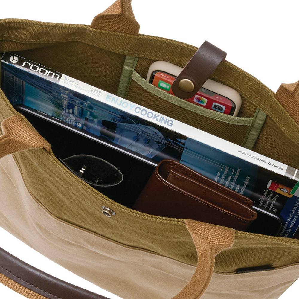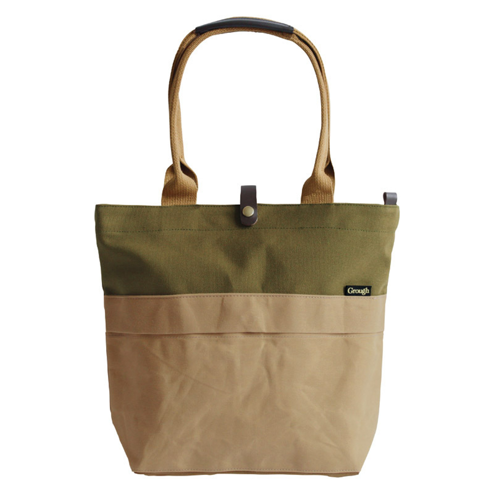 | 内容量 | 30×36(25)×10cm・本体:綿(前面ポケット部分のみパラフィン加工)・牛革、持手:アクリル |