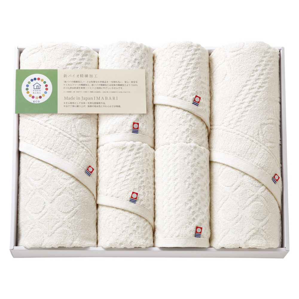 | 内容量 | バスタオル(60×110cm)・フェイスタオル(34×75cm)・ウォッシュタオル(34×30cm)×各2・綿100% |