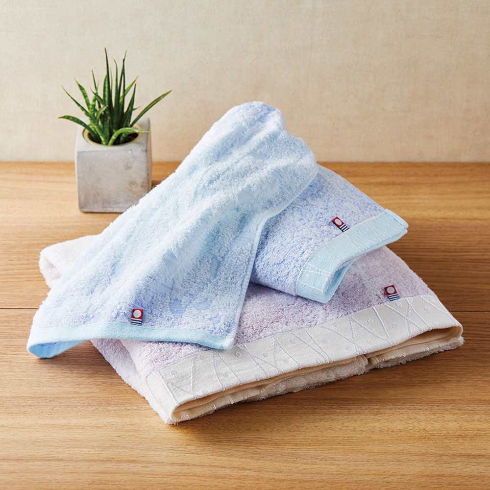 タオルの名産地である今治で丁寧に織り上げたタオルは吸水性にすぐれ、ふんわりしたやわらかな風合いが長続きするのが特徴です。