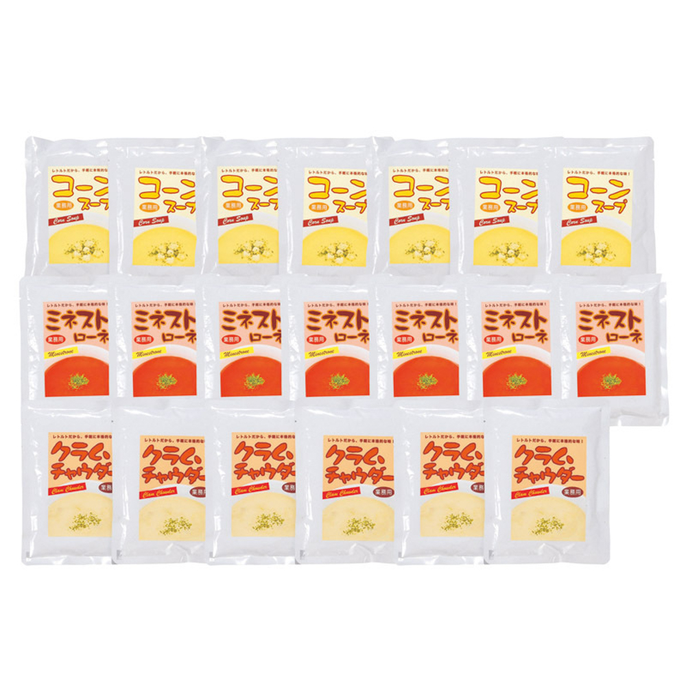 NEWコーンスープ(140ml)・NEWミネストローネ(140ml)×各7、NEWクラムチャウダー(140ml)×6