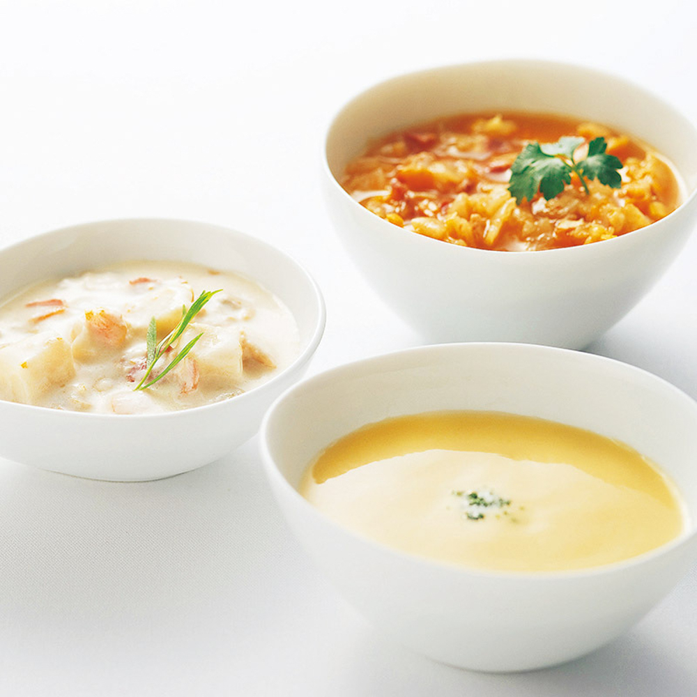 甘くてやさしいコーンスープ、旨みたっぷりクラムチャウダー、ミネストローネのセットです。