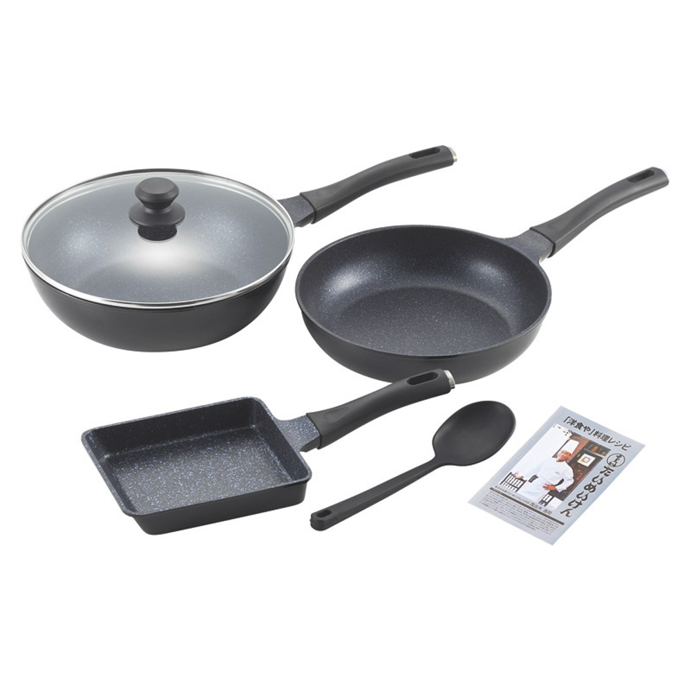 | 内容量 | アルミ鋳物玉子焼(15×16cm)・フライパン(径26cm)・炒め鍋28cm(49.8×28.9×14.6cm)・シリコンスプーン×各1・アルミ鋳物玉子焼・フライパン・炒め鍋:(本体)アルミニウム合金(内面マーブルフッ素樹脂塗膜加工)・(底部)ステンレス鋼・(取っ手)フェノール樹脂、フタ:強化ガラス、ツマミ:フェノール樹脂、シリコンスプーン:シリコーンゴム |