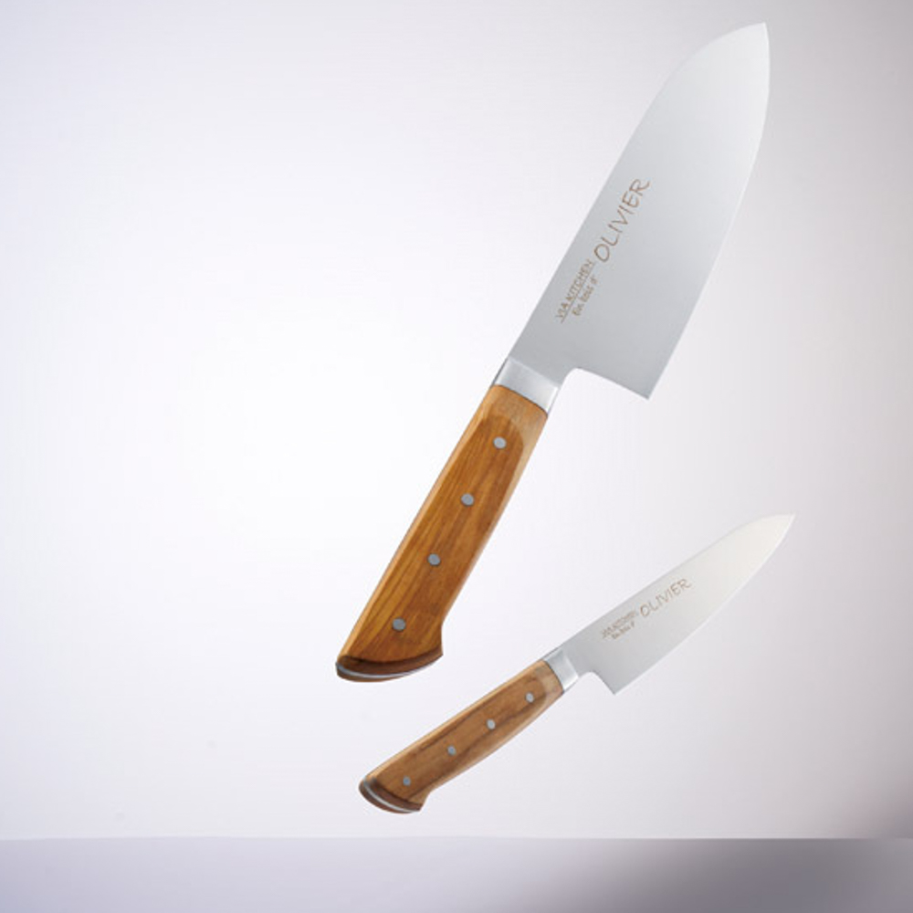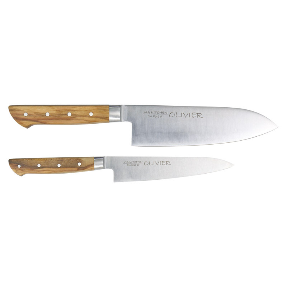 三徳包丁(刃渡16.5cm)・ペティナイフ(刃渡13.5cm)×各1・モリブデンステンレス刃物鋼、柄:オリーブ材
