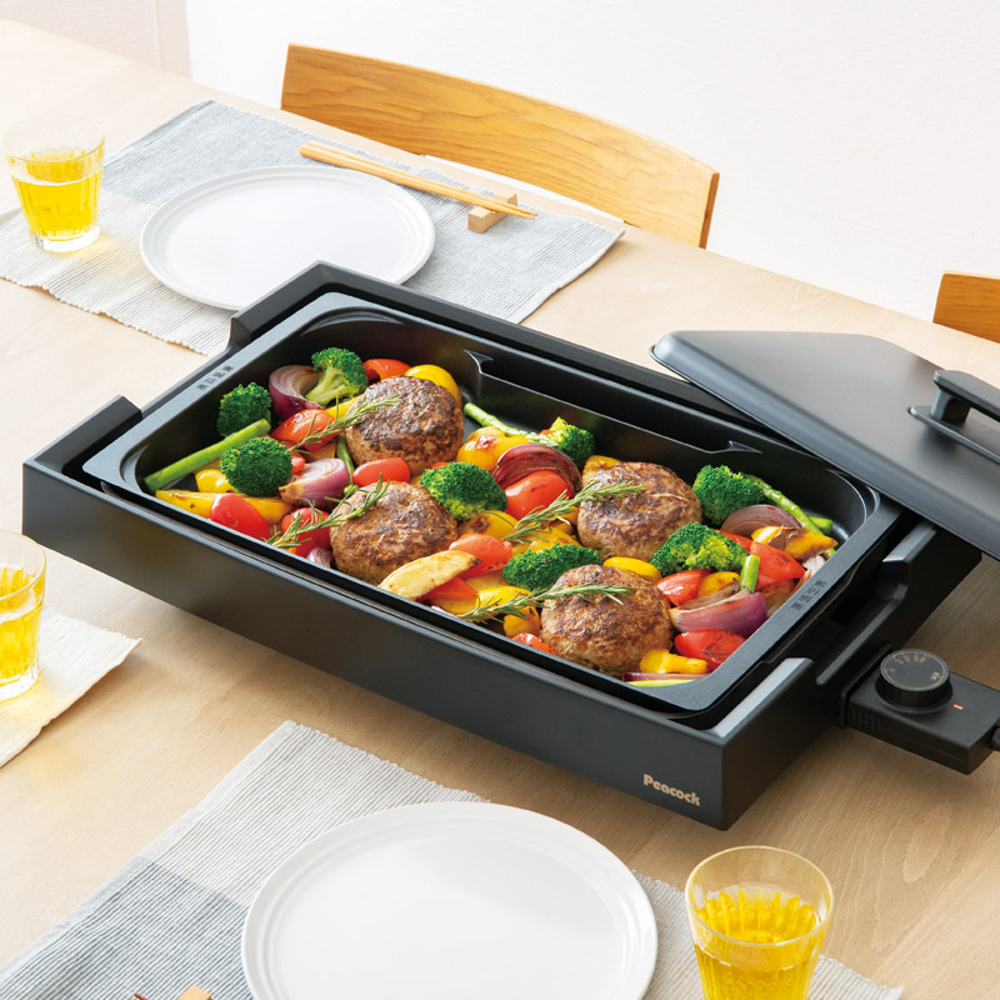 さし水溝を備えたスチームホットプレートで蒸すと焼くの調理法が可能です。